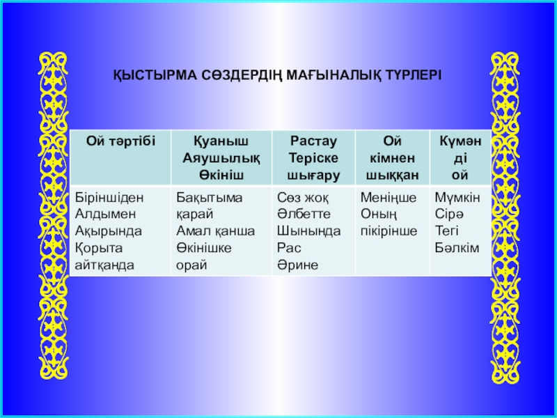 Слайд 10ҚЫСТЫРМА СӨЗДЕРДІҢ МАҒЫНАЛЫҚ ТҮРЛЕРІ
