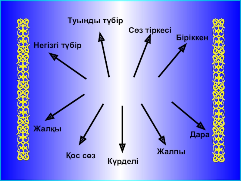 Негізгі түбірТуынды түбірДараКүрделіЖалқыЖалпыБіріккенҚос сөзСөз тіркесі