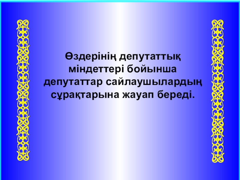 Слайд 8Өздерінің депутаттық міндеттері бойынша депутаттар сайлаушылардың сұрақтарына жауап береді.