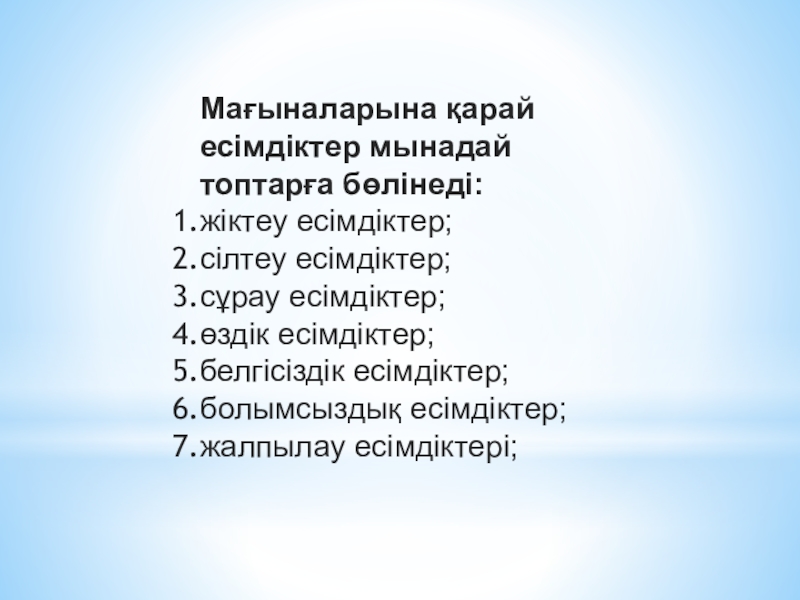 Слайд 2Мағыналарына қарай есімдіктер мынадай топтарға бөлінеді:
