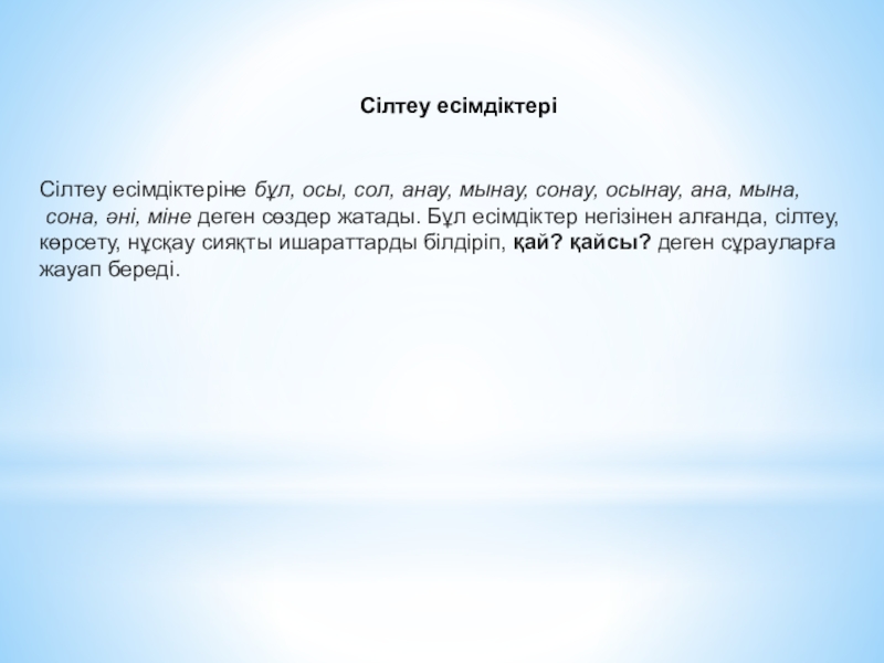 сона, әні, міне деген сөздер жатады. Бұл есімдіктер негізінен алғанда, сілтеу,
