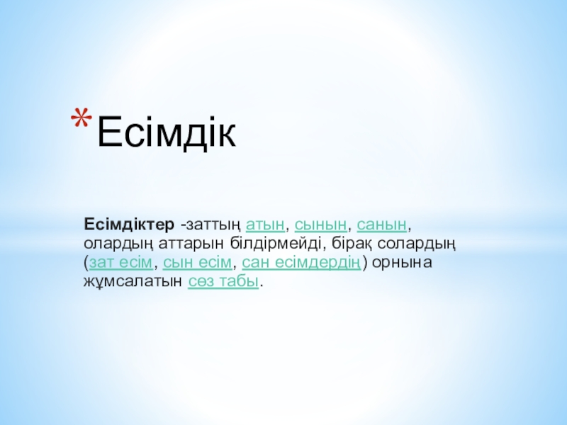 Слайд 1Есімдіктер -заттың атын, сынын, санын,олардың аттарын білдірмейді, бірақ солардың (зат есім, сын есім, сан есімдердің) орнына жұмсалатын сөз