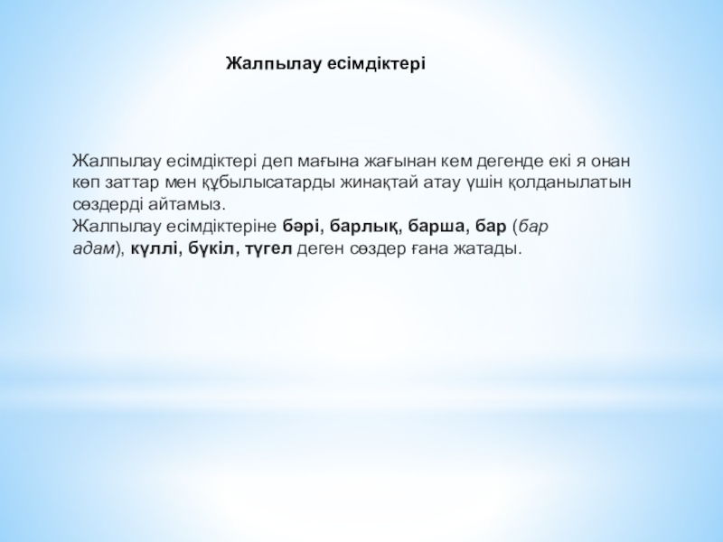 Жалпылау есімдіктеріне бәрі, барлық, барша, бар (бар адам), күллі, бүкіл, түгел деген сөздер ғана жатады.