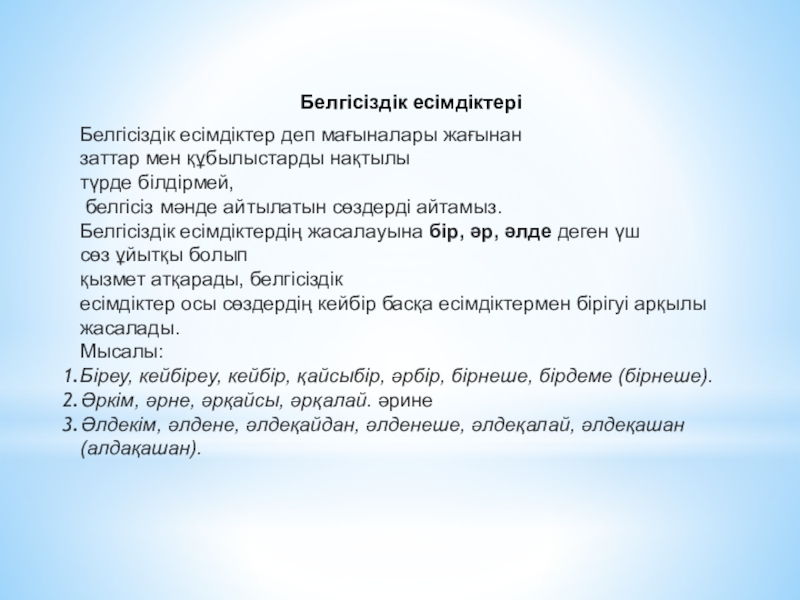 Белгісіздік есімдіктердің жасалауына бір, әр, әлде деген үш
