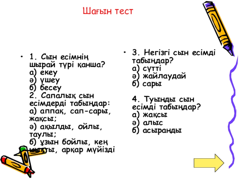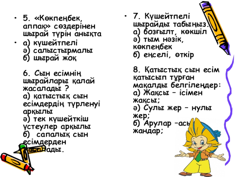 8. Қатыстық сын есім қатысып тұрған мақалды белгілеңдер: