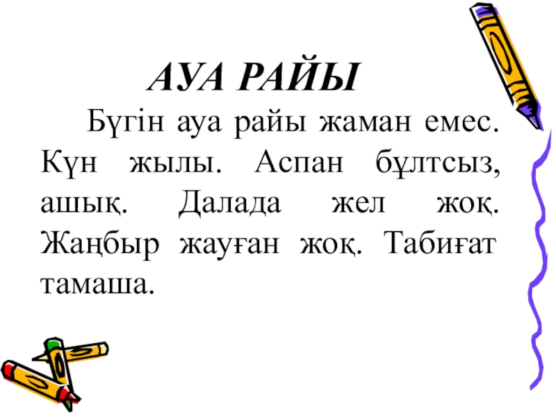 Ауа райы     Бүгін ауа райы жаман емес. Күн жылы. Аспан бұлтсыз, ашық. Далада