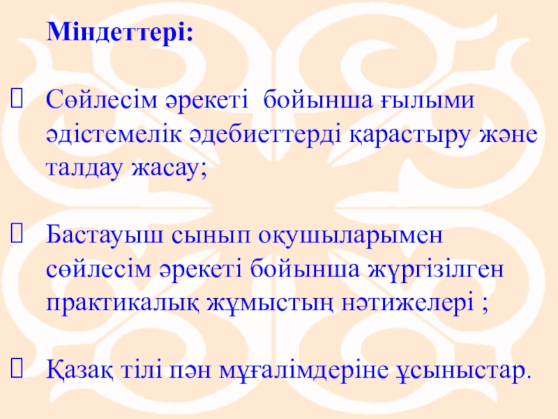 Міндеттері:Сөйлесім әрекеті бойынша ғылыми әдістемелік әдебиеттерді қарастыру және талдау жасау;Бастауыш сынып оқушыларымен сөйлесім әрекеті
