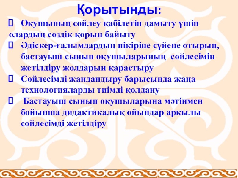 Қорытынды:Оқушының сөйлеу қабілетін дамыту үшін олардың сөздік қорын байытуӘдіскер-ғалымдардың пікіріне сүйене отырып, бастауыш сынып оқушыларының сөйлесімін жетілдіру