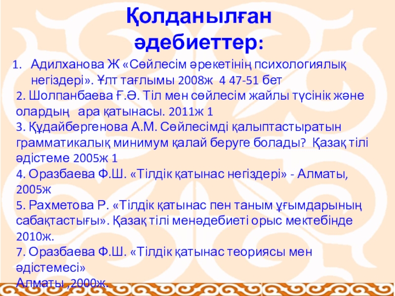 Қолданылған әдебиеттер:Адилханова Ж «Сөйлесім әрекетінің психологиялық негіздері». Ұлт тағлымы 2008ж 4 47-51 бет2. Шолпанбаева Ғ.Ә. Тіл мен