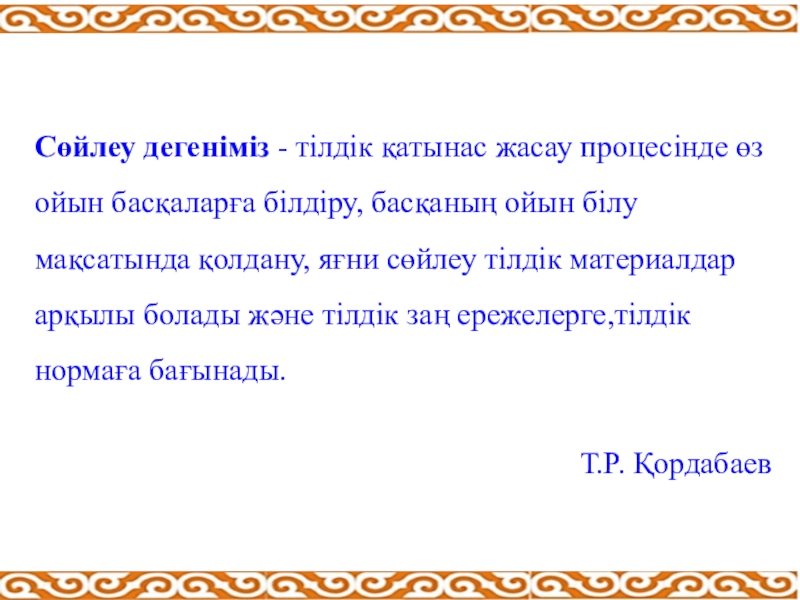 Оразбаева Фаузия Шәмсиқызы профессор, ғалымСөйлесім - бұл адам мен адамның қарым-қатынаста бір-бірімен тілдесуі,яғни бір адамның өз ойын