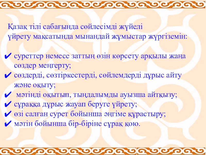 Слайд 8Қазақ тілі сабағында сөйлесімді жүйелі