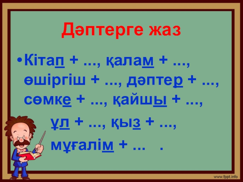 Дәптерге жазКітап + ..., қалам + ..., өшіргіш + ..., дәптер + ..., сөмке + ..., қайшы