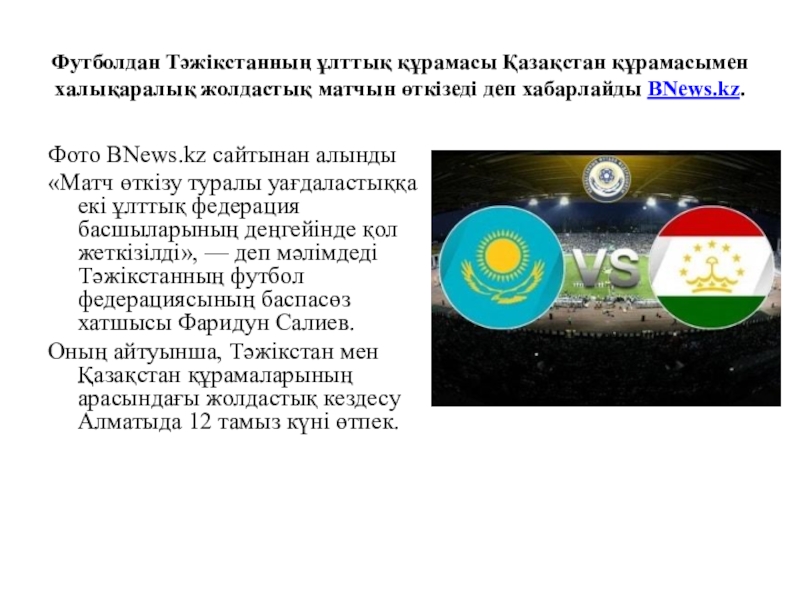 Оның айтуынша, Тәжікстан мен Қазақстан құрамаларының арасындағы жолдастық кездесу Алматыда 12 тамыз күні өтпек.