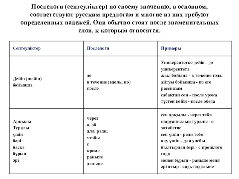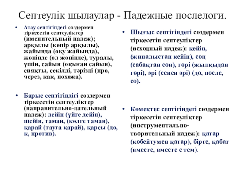 Көмектес септігіндегі сөздермен тіркесетін септеуліктер (инструментально-творительный падеж): қатар (көбейтумен қатар), бірге, қабат (вместе, вместе с тем).