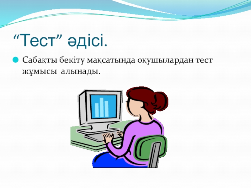 “Тест” әдісі.Сабақты бекіту мақсатында оқушылардан тест жұмысы алынады.