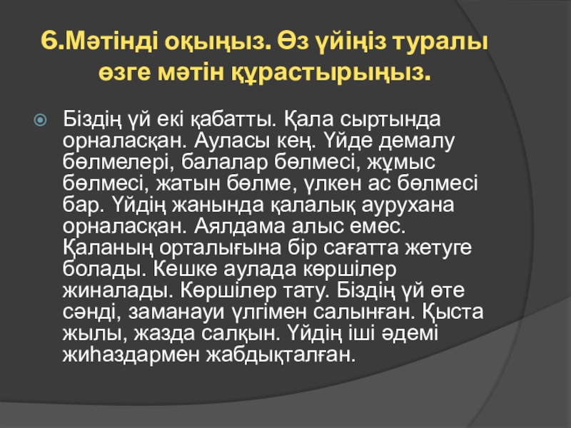 6.Мәтінді оқыңыз. Өз үйіңіз туралы өзге мәтін құрастырыңыз.Біздің үй екі қабатты. Қала сыртында орналасқан. Ауласы кең.