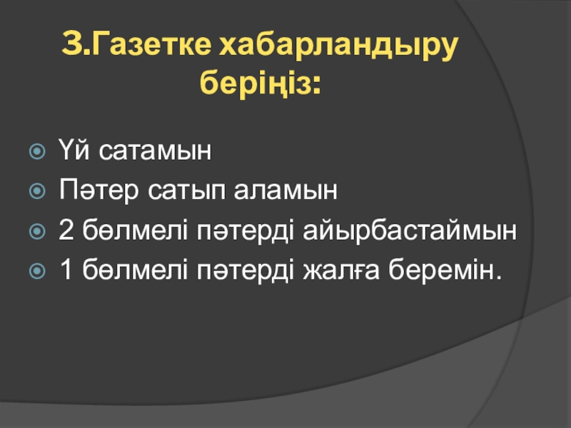 3.Газетке хабарландыру беріңіз:Үй сатамынПәтер сатып аламын2 бөлмелі пәтерді айырбастаймын1 бөлмелі пәтерді жалға беремін.