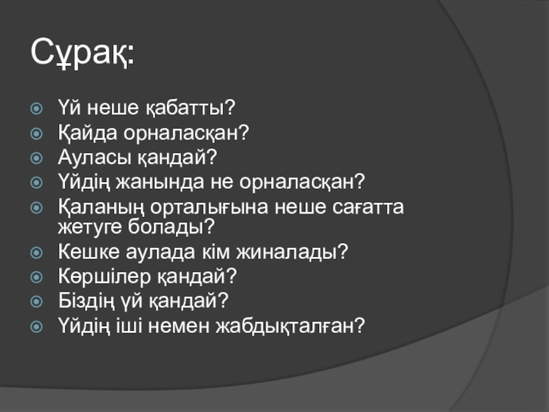 Сұрақ:Үй неше қабатты?Қайда орналасқан?Ауласы қандай?Үйдің жанында не орналасқан?Қаланың орталығына неше сағатта жетуге болады?Кешке аулада кім жиналады?Көршілер қандай?Біздің