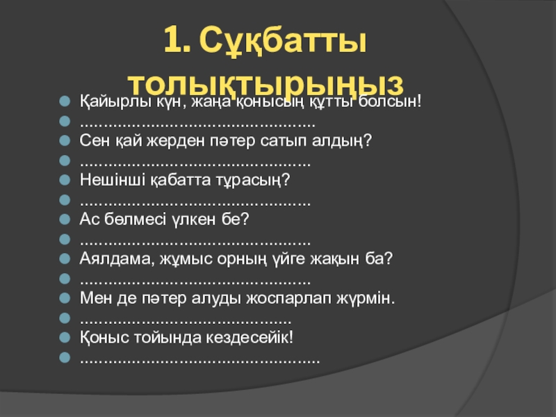 1. Сұқбатты толықтырыңызҚайырлы күн, жаңа қонысың құтты болсын!..................................................Сен қай жерден пәтер сатып алдың?.................................................Нешінші қабатта тұрасың?.................................................Ас бөлмесі үлкен
