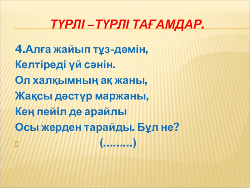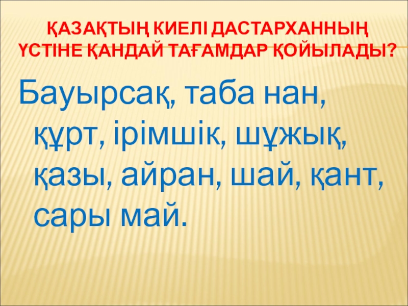Слайд 20ҚАЗАҚТЫҢ КИЕЛІ ДАСТАРХАННЫҢ ҮСТІНЕ ҚАНДАЙ ТАҒАМДАР ҚОЙЫЛАДЫ?