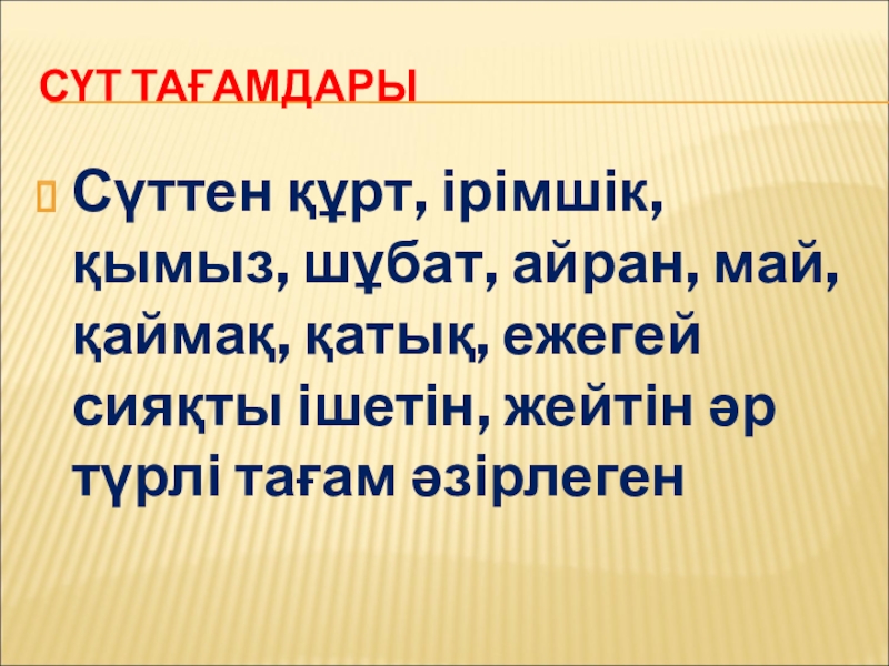 Сүттен құрт, ірімшік, қымыз, шұбат, айран, май, қаймақ, қатық,