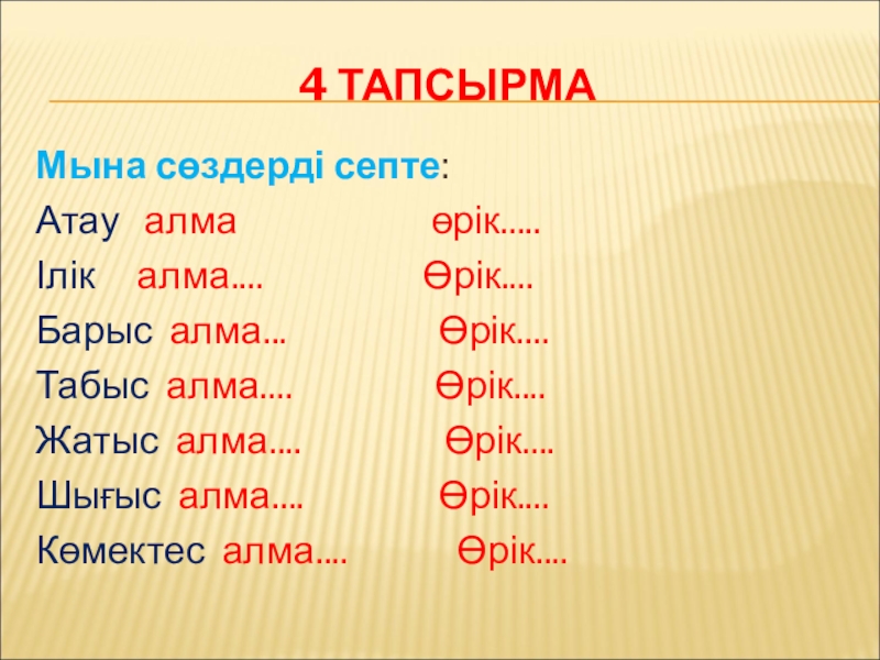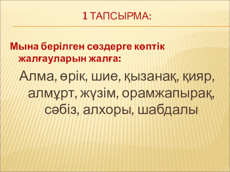 Мына берілген сөздерге көптік жалғауларын жалға: