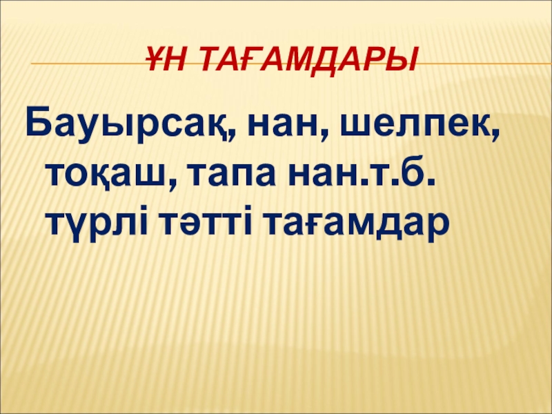 Бауырсақ, нан, шелпек, тоқаш, тапа нан.т.б. түрлі тәтті тағамдар