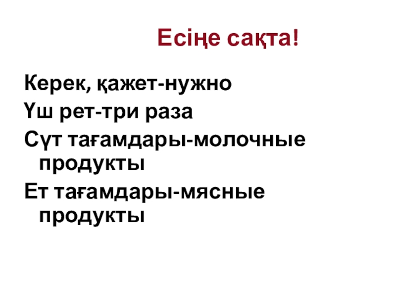 Есіңе сақта!Керек, қажет-нужноҮш рет-три разаСүт тағамдары-молочные продуктыЕт тағамдары-мясные продукты