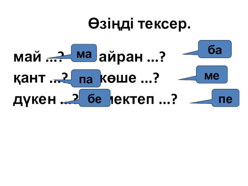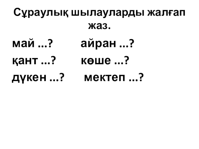 Слайд 6Сұраулық шылауларды жалғап жаз.