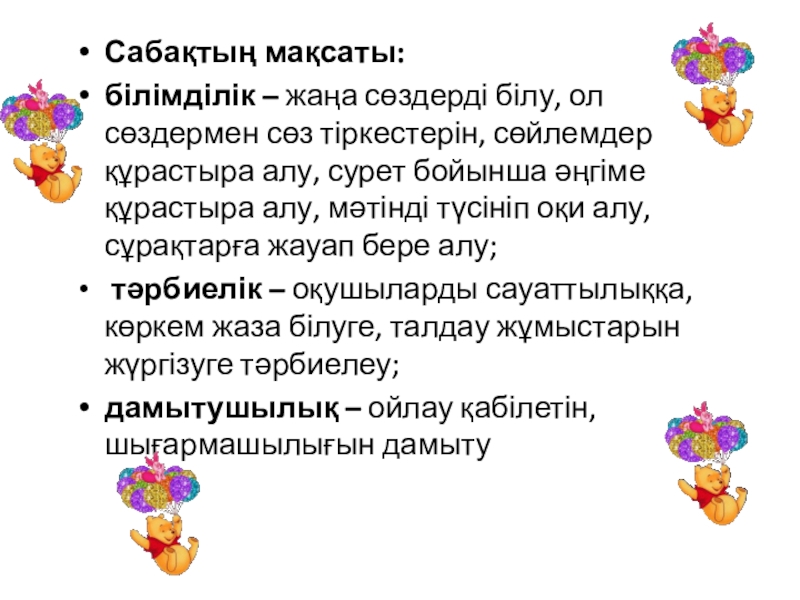 Сабақтың мақсаты:	білімділік – жаңа сөздерді білу, ол сөздермен сөз тіркестерін, сөйлемдер құрастыра алу, сурет бойынша әңгіме құрастыра