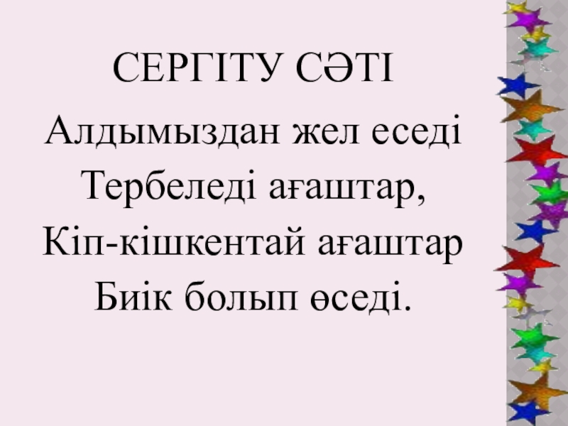 СЕРГІТУ СӘТІАлдымыздан жел еседіТербеледі ағаштар,Кіп-кішкентай ағаштарБиік болып өседі.