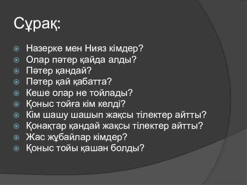 Сұрақ:Назерке мен Нияз кімдер?Олар пәтер қайда алды?Пәтер қандай?Пәтер қай қабатта?Кеше олар не тойлады?Қоныс тойға кім келді?Кім шашу