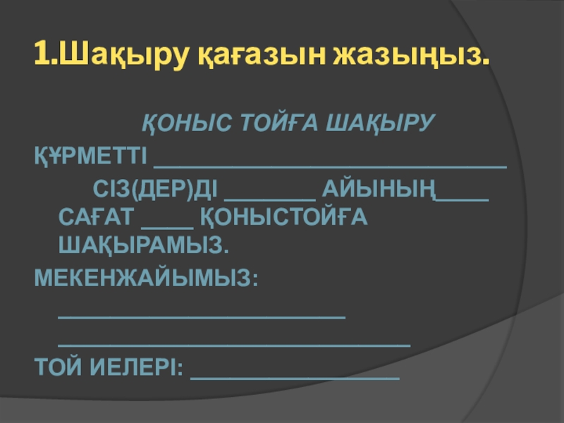 1.Шақыру қағазын жазыңыз.ҚОНЫС ТОЙҒА ШАҚЫРУҚұрметті ___________________________     Сіз(дер)ді _______ айының____ сағат ____ қоныстойға шақырамыз.Мекенжайымыз: