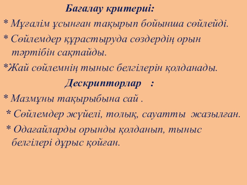 Бағалау критериі:* Мұғалім ұсынған тақырып бойынша балалар сөйлейді.* Жай сөйлемнің тыныс белгілерін қолданады.* Сөйлемдер құрастыруда сөздердің орын