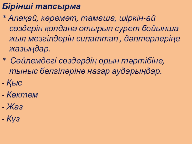 Бірінші тапсырма* Алақай, керемет, тамаша, шіркін-ай сөздерін қолдана отырып сурет бойынша жыл мезгілдерін сипаттап , дәптерлеріңе жазыңдар.*