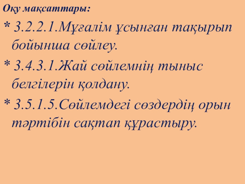 Оқу мақсаттары: * 3.2.2.1.Мұғалім ұсынған тақырып бойынша сөйлеу.* 3.4.3.1.Жай сөйлемнің тыныс белгілерін қолдану.* 3.5.1.5.Сөйлемдегі сөздердің орын тәртібін