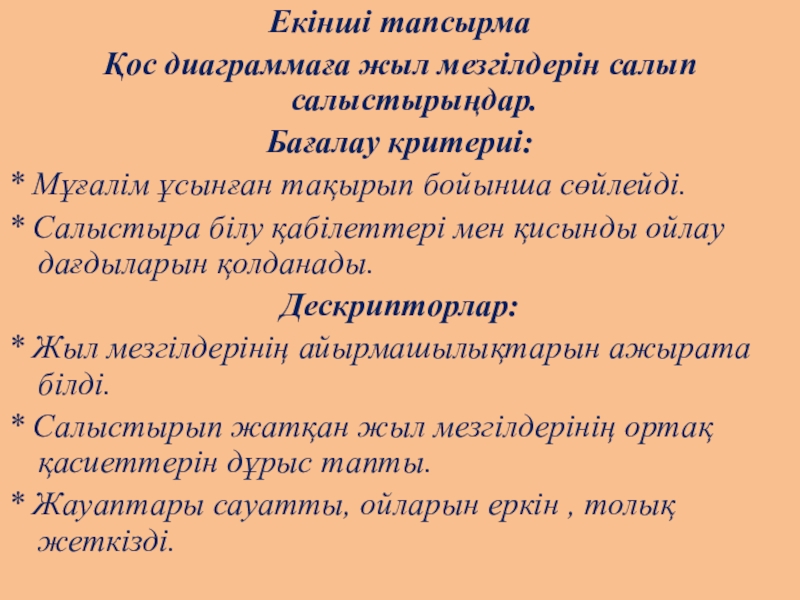 Екінші тапсырмаҚос диаграммаға жыл мезгілдерін салып салыстырыңдар.Бағалау критериі:* Мұғалім ұсынған тақырып бойынша сөйлейді.* Салыстыра білу қабілеттері мен