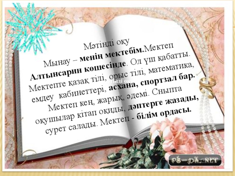 dМәтінді оқуМәтінді оқуМынау – менің мектебім.Мектеп Алтынсарин көшесінде. Ол үш қабатты. Мектепте қазақ тілі, орыс тілі, математика,