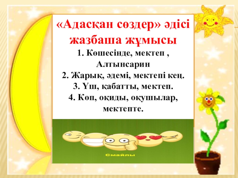 «Адасқан сөздер» әдісіжазбаша жұмысы1. Көшесінде, мектеп ,Алтынсарин2. Жарық, әдемі, мектепі кең.3. Үш, қабатты, мектеп.4. Көп, оқиды, оқушылар,