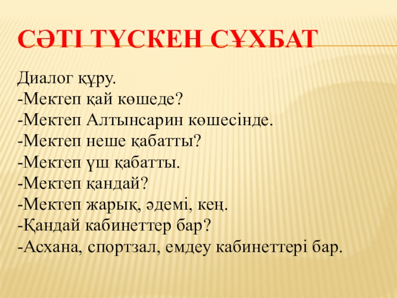 Сәті түскен сұхбат Диалог құру.-Мектеп қай көшеде?-Мектеп Алтынсарин көшесінде.-Мектеп неше қабатты?-Мектеп үш қабатты.-Мектеп қандай?-Мектеп жарық, әдемі, кең.-Қандай