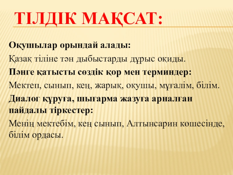 Тілдік мақсат:Оқушылар орындай алады:Қазақ тіліне тән дыбыстарды дұрыс оқиды.Пәнге қатысты сөздік қор мен терминдер:Мектеп, сынып, кең, жарық,
