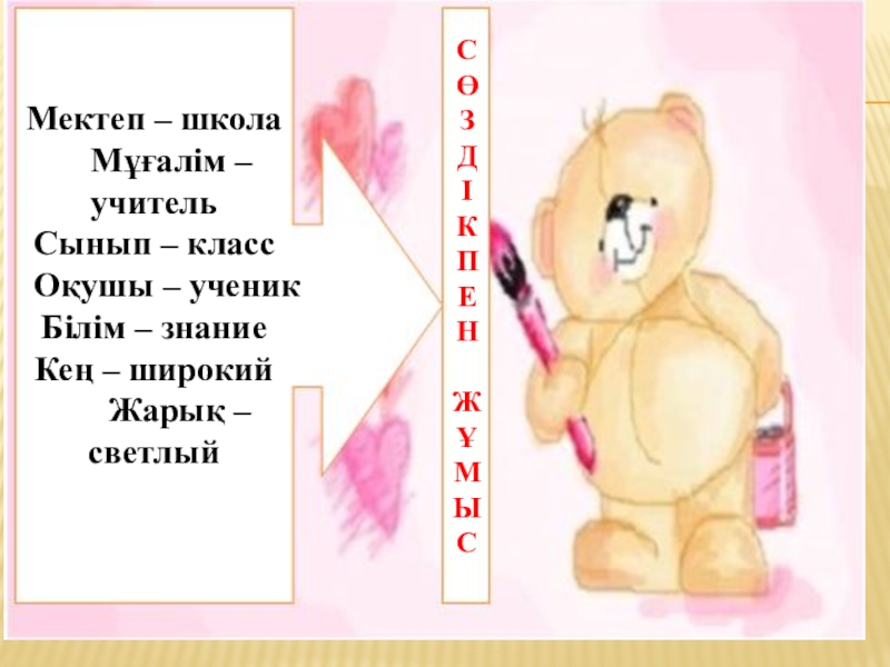 СӨЗДІКПЕНЖҰМЫСМектеп – школа   Мұғалім – учительСынып – класс  Оқушы – ученик Білім – знание
