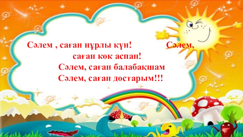 Сәлем , саған нұрлы күн! Сәлем,саған көк аспан! Сәлем, саған балабақшам Сәлем, саған достарым!!!