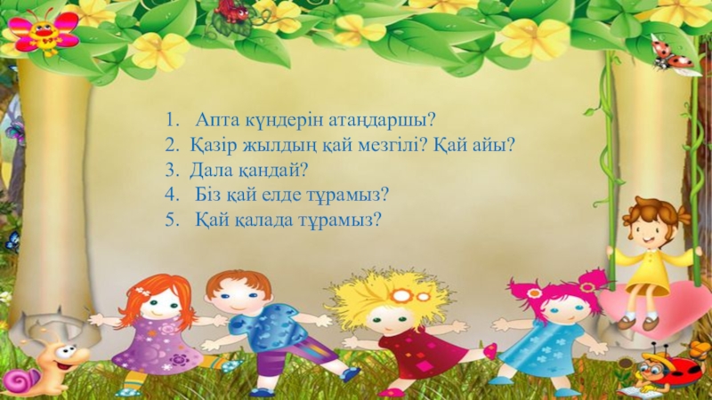 Апта күндерін атаңдаршы?Қазір жылдың қай мезгілі? Қай айы?Дала қандай? Біз қай елде тұрамыз? Қай қалада тұрамыз?