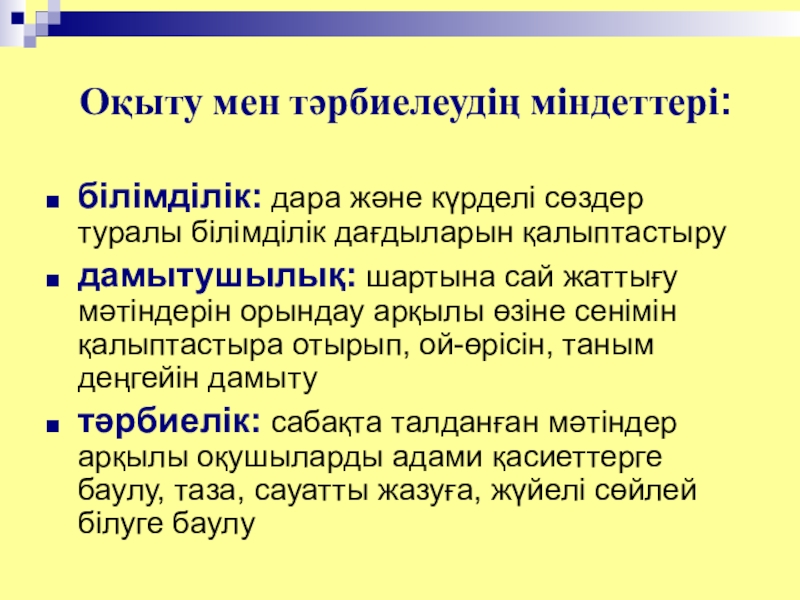 Слайд 3Оқыту мен тәрбиелеудің міндеттері: