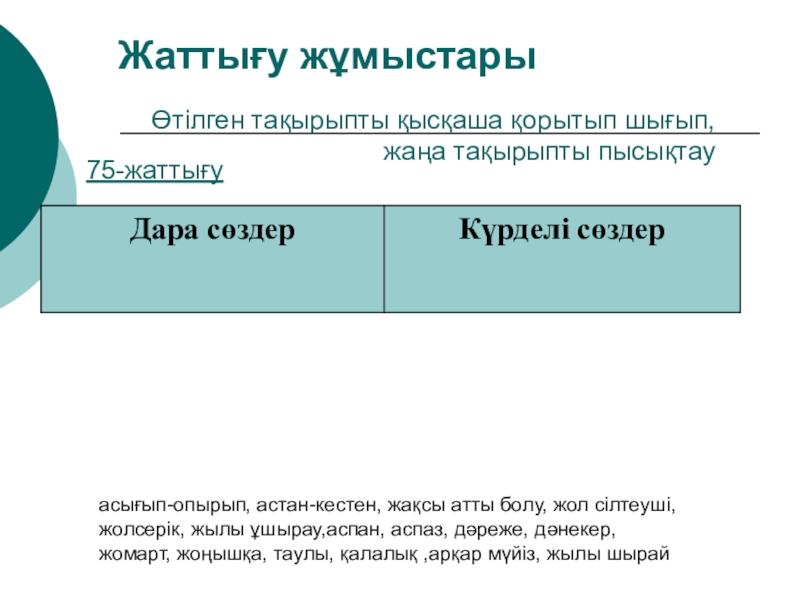Жаттығу жұмыстарыӨтілген тақырыпты қысқаша қорытып шығып, жаңа тақырыпты пысықтау 75-жаттығу асығып-опырып, астан-кестен, жақсы атты болу, жол сілтеуші,