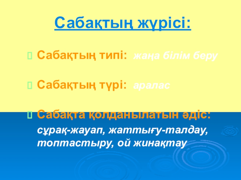 Сабақтың жүрісі:Сабақтың типі: жаңа білім беру Сабақтың түрі: аралас Сабақта қолданылатын әдіс:  сұрақ-жауап, жаттығу-талдау, топтастыру, ой