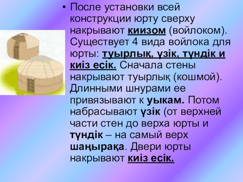 Слайд 16После установки всей конструкции юрту сверху накрывают киизом (войлоком). Существует 4