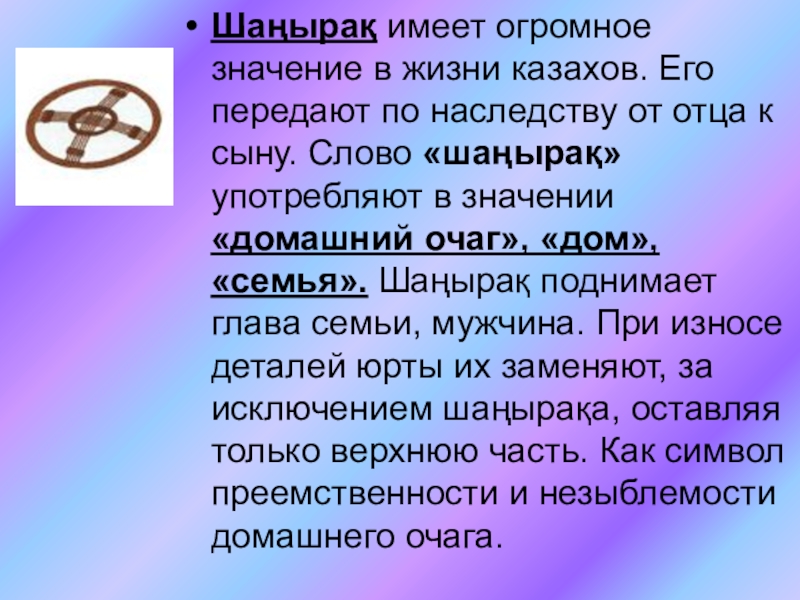 Слайд 12Шаңырақ имеет огромное значение в жизни казахов. Его передают по наследству