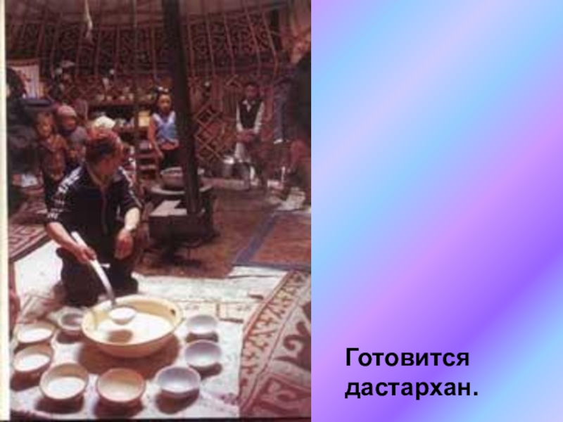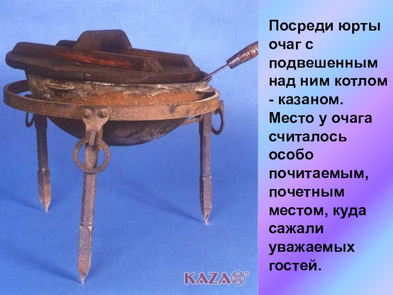 Слайд 55Посреди юрты очаг с подвешенным над ним котлом - казаном.